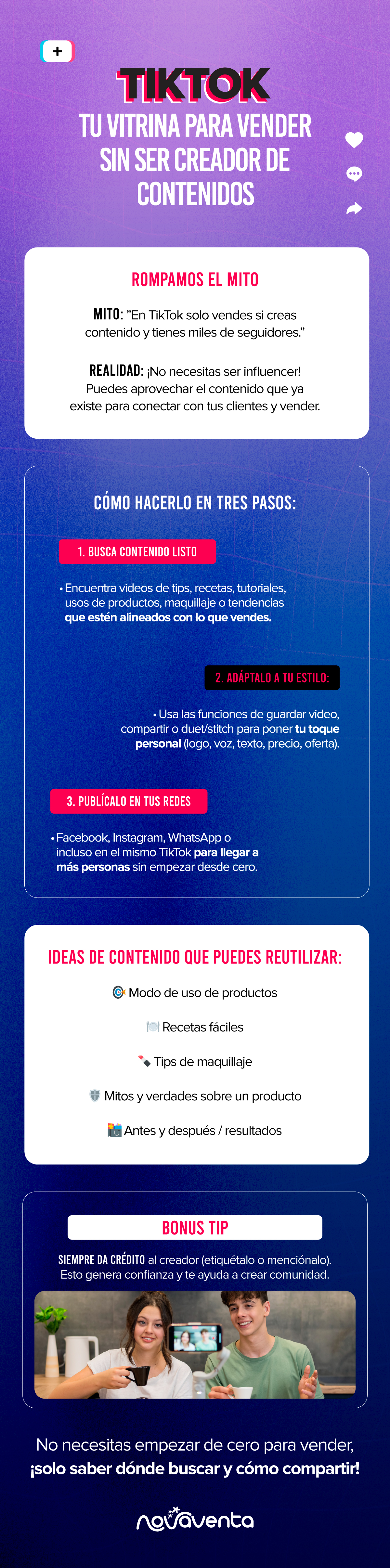 ¡Quítate el miedo a la cámara! No necesitas ser un creador de contenido experto para triunfar en TikTok. Descubre cómo aprovechar las tendencias actuales y el contenido existente para impulsar tu negocio Novaventa de manera inteligente. Revisa estas claves estratégicas y convierte tu perfil en un motor de ventas constante.